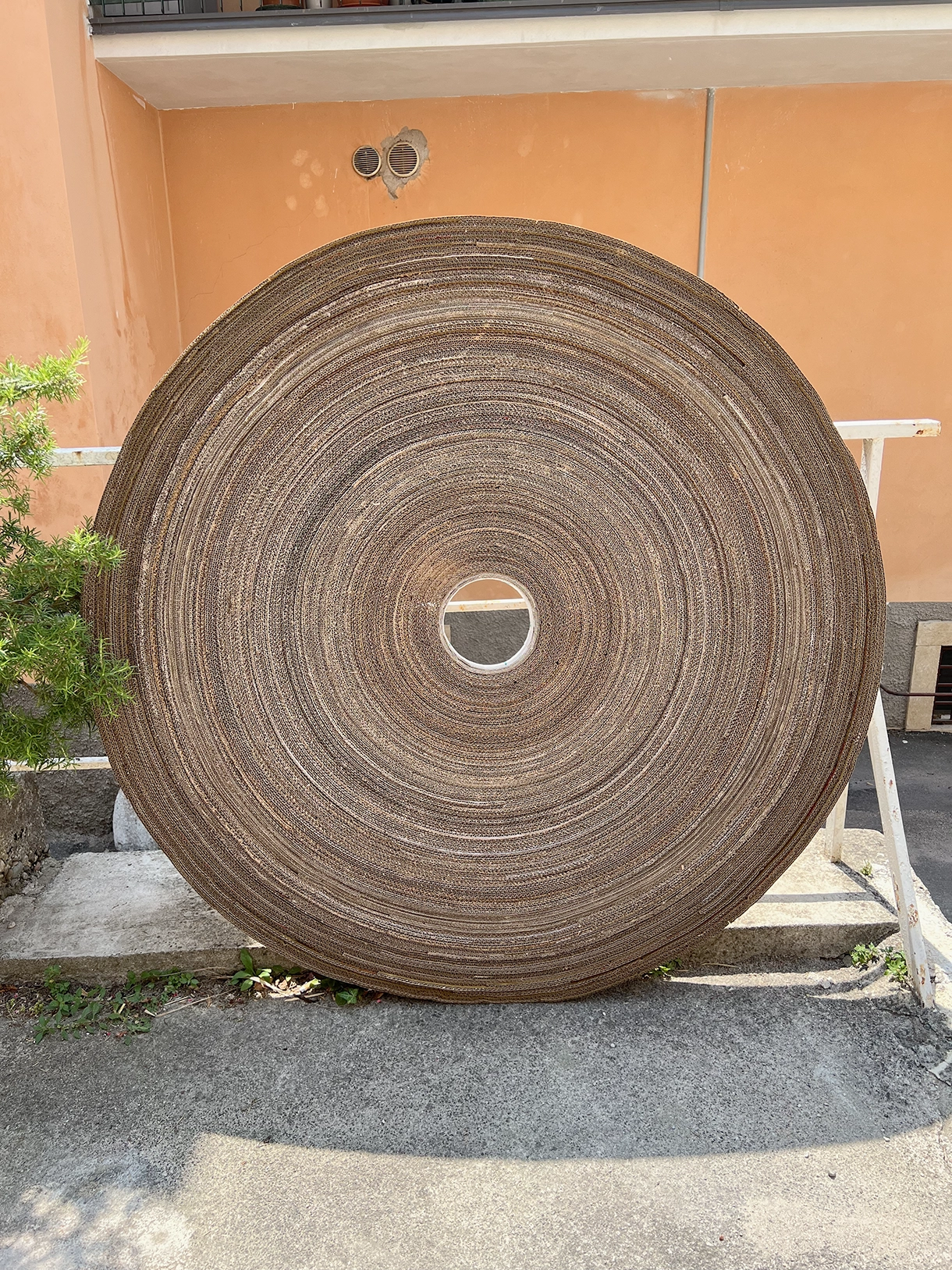 Made by gluing hundreds of meters of cardboard strip into the form of a shallow disk. This thing got a lot bigger on site, as well...