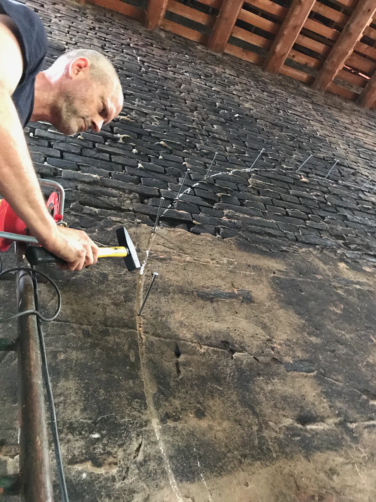 Hammering nails into the soft, blackened brick of the tobacco drying barn.